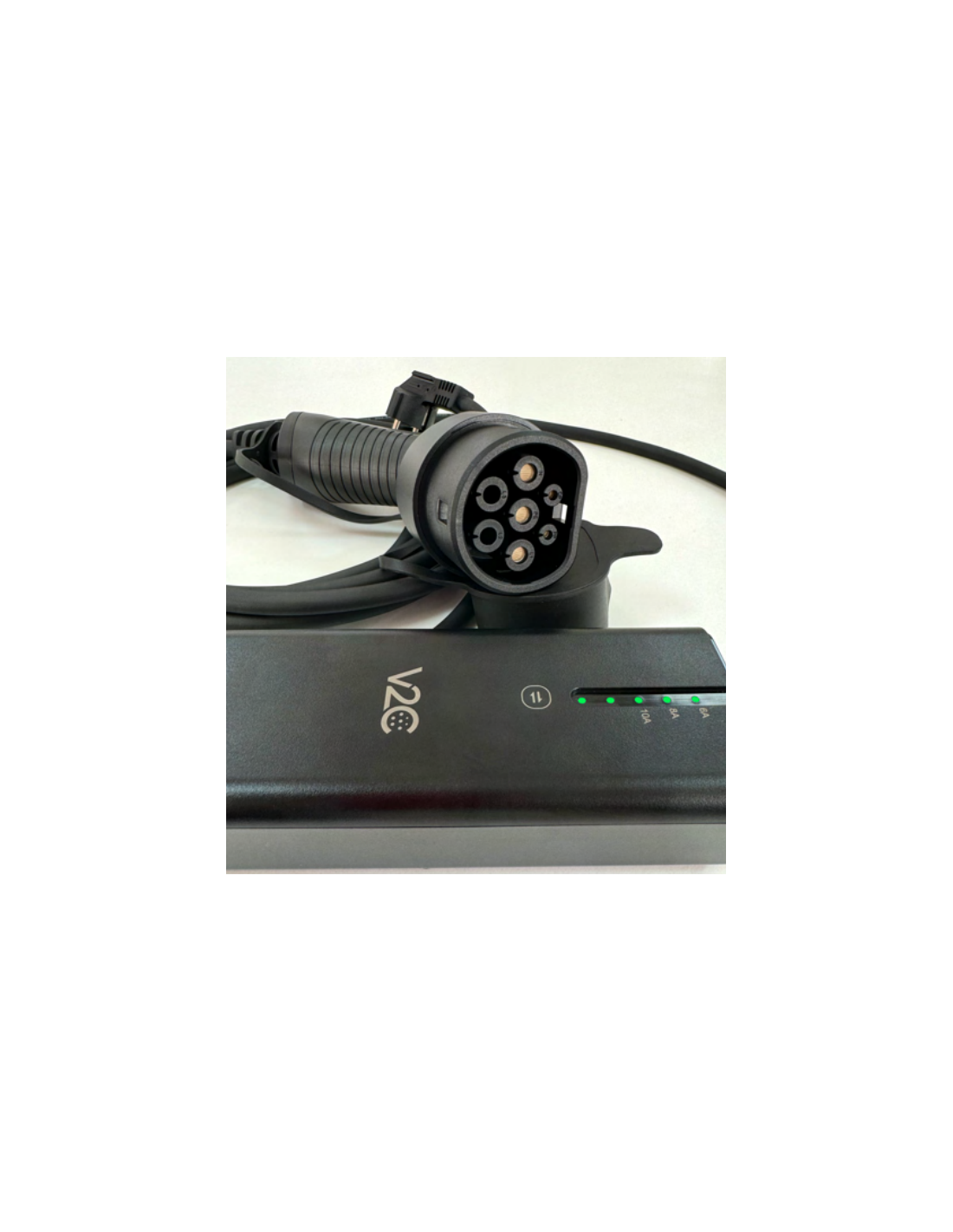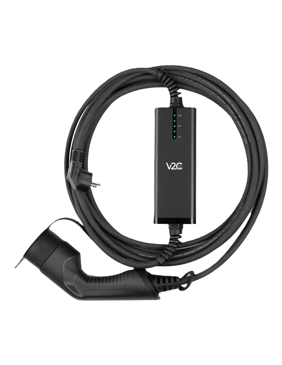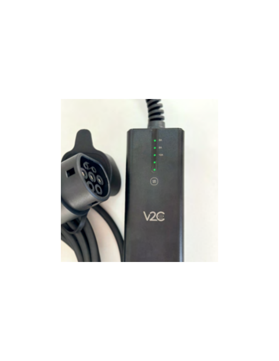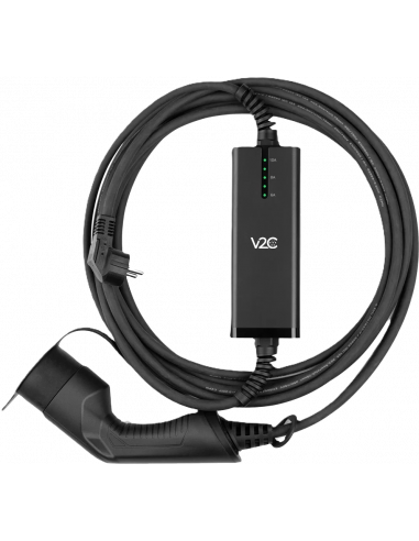 Cable de carga modo 2 portátil de V2C, con selección de intensidades de 6-8-10 A: regula la intensidad de carga de forma manual según tus necesidades.